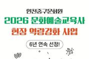 인천중구문화원(원장 박봉주)이 문화체육관광부와 인천광역시가 주최하고, 인천문화재단 인천문화예술교육지원센터와 한국문화예술교육진흥원이 주관하는 '2026 문화예술교육사 현장 역량강화 사업(인천)'에 6년 연속 선정되는 쾌거를 달성했다. ‘문화예술교육사 현장 역량강화 사업’은 문화예술교육사의 전문성 강화를 통해 지역의 문화예술교육 역량을 높이고, 주민들을 위한 우수한 문화예술교육 프로그램 개발과 운영을 지원하는 사업이다. 인천중구문화원은 지난 5년간의 성공적인 사업 운영 성과를 인정받아 올해도 본 사업에 연속 선정되며, 지역 문화예술교육의 거점으로서 입지를 공고히 했다. 특히, 오는 7월 예정된 인천시 행정체제 개편에 따라 ‘인천영종구문화원’으로의 새로운 출발을 앞두고 있어 그 의미가 더욱 남다르다. 올 하반기부터 인천중구문화원은 ‘영종구’로 거점을 이전하여 지역적 특성을 반영한 새롭고 다채로운 문화예술교육 프로그램을 선보일 계획이며, 이에 발맞춰 영종구에서 새롭게 호흡을 맞추며 프로그램을 기획·운영할 역량 있는 신규 문화예술교육사 채용 진행중에 있다. 인천중구문화원 박봉주 원장은 “6년 연