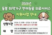 수원특례시는 돌봄 취약가구의 반려동물 양육 부담을 덜고 동물복지를 강화하기 위해 ‘2026년 돌봄 취약가구 반려동물 의료서비스 지원사업’을 추진한다. 지원 대상은 수원시에 주민등록을 두고 실제 거주하며 본인 명의로 반려동물을 등록해 기르는 기준중위소득 85% 이하 가구다. 저소득층, 중증장애인, 한부모가정, 다문화가정, 1인가구 등이 포함된다. 경기도 공공입양기관에서 국가봉사동물을 입양한 경우는 소득과 관계없이 지원한다. 보호자 1명당 2마리까지 신청할 수 있다. 동일 동물은 ‘의료·돌봄·장례 지원’ 또는 ‘노령동물 종합건강검진’ 중 한 가지 항목만 선택해 지원한다. 의료·돌봄·장례 지원은 마리당 최대 16만 원(초과비용 자부담), 노령동물 종합건강검진은 최대 32만 원(초과비용 자부담)까지 지원한다. 노령동물 검진은 2019년 12월 31일 이전 출생한 반려동물에 한한다. 의료지원에는 백신접종, 중성화수술, 기본검진·치료비 등이 포함되고, 돌봄 위탁비와 장묘 서비스도 지원한다. 노령 반려동물은 종합건강검진을 받을 수 있으며 모든 서비스는 관내 업체를 이용해야 한다. 신청 기간은 3월
