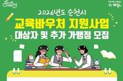 순천시가 가정형편 등으로 학원 수강이 어려운 취약계층 가정 학생들에게 수강료를 지원하는 교육바우처 사업을 시행한다. 2026년 교육바우처 지원사업은 기초수급자·차상위계층·한부모·조손·다자녀 가정 등의 초·중·고등학생을 대상으로 예체능, 직업기술, 제2외국어 과목(국·영·수 제외)에 대해 수강료를 지원하는 사업이다. 희망자는 시 홈페이지 게시판, 읍면동 행정복지센터를 통해 신청서 작성 및 구비서류를 준비해 1월 19일부터 2월 20일까지 주소지 읍면동 행정복지센터에 방문․제출하면 된다. 지원 대상자는 자체 선정심사를 통해 확정 후 3월부터 12월까지 수강료를 지원받게 되며, 선정된 학생들에게 교육바우처 카드를 지급, 가맹점으로 등록된 학원에서 사용하면 된다. 또한, 교육바우처 지원사업에 참여를 원하는 학원은 가맹점 등록 신청서 등을 작성해 순천시 평생교육과로 제출하면 된다. 시 관계자는 “순천시 교육바우처 지원 사업으로 가정형편이 어려운 학생들이 교육비 걱정을 덜고 배움의 기회를 넓히는 데 도움이 되기를 바란다”며, “앞으로도 누구나 공평하게 교육받을 수 있는 순천시를 만드는 데 최선을