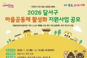 대구 달서구는 주민이 스스로 마을에 필요한 사업을 발굴하고 실행하는 ‘2026년 마을공동체 활성화 지원사업’ 참여자를 2월 13일까지 모집한다. 올해로 7년째를 맞는 달서구 마을공동체 활성화 지원사업은 2020년부터 현재까지 총 79건의 사업을 지원해 왔으며, 탄소중립 실천, 공동텃밭, 공동육아, 소외계층 돌봄, 마을축제 등 다양한 분야에서 주민 주도의 마을문제 해결과 공동체 기반 확충에 기여하고 있다. 이번 공모는 총 3개 분야로 15개팀 내외를 선정해 공동체 역량과 사업 성격에 따라 단계별로 사업비를 지원한다. 지원 규모는 ▲ 신규 공동체를 위한 ‘신참마을’ 200만원 이내 ▲ 경험 있는 공동체를 위한 ‘도약마을’ 300만원 이내 ▲ 마을축제 등을 위한 ‘주민화합행사’ 500만원 이내이다. 신청 자격은 5인 이상 달서구 주민 모임 또는 단체이며, ‘주민화합행사’는 10인 이상이 참여해야 한다. 또한 교육·환경·복지·안전·문화 등 마을에 필요한 다양한 분야에서 다수 주민이 공감하고 함께 참여할 수 있는 공익성 사업이어야 한다. 신청 서식과 자세한 사항은 달서구청 홈페이지
